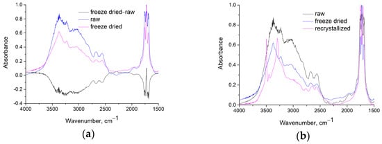 (a) FTIR spectra of the raw and the freeze-dried samples and their subtracted spectra (freeze dried-raw) and (b) FTIR of the raw, recrystallized and freeze-dried samples.