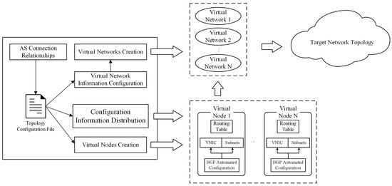 In the context of virtualized simulation experiments, manually establishing routing configurations on virtual nodes can be time-consuming and cumbersome once the target network topology is determined. Therefore, an automatic loading technique for configuration based on the BGP and the RPKI has been designed to achieve a virtual-level routing configuration. Specifically, on the basis of the routing configuration information in the topology configuration file, configuration details such as AS neighbor relationships and directly connected networks of the virtual router nodes are sent to the configuration program within the virtual router nodes. This process completes the automation of the BGP configuration. On the basis of the information about the RP nodes owned by the virtual router nodes, configuration details such as the RP node’s IP addresses and ROV routing policies are subsequently sent to all the virtual router nodes that require the RPKI configuration, which automates the RPKI configuration.