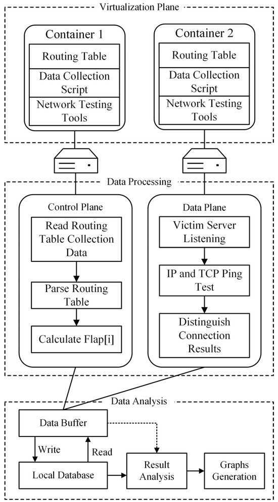 To measure the security defense effect of the RPKI and conduct a security analysis under partially deployed conditions, this paper designs and implements a data acquisition and analysis technique as illustrated in Figure 4. This technique injects the data collection scripts into the targeted virtual nodes to perform accessibility tests at both the control plane and data plane levels, thereby measuring the route propagation that occurs after an attack. For the post attack results, we collect critical data in the following two aspects: