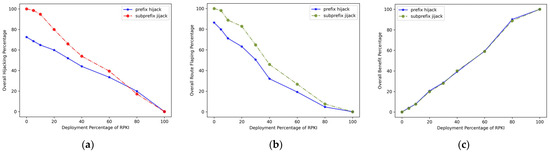 On the basis of the target network topology information, the experimental results of the prefix hijacking and subprefix hijacking attacks conducted according to the simulation test designed in this paper are shown in Figure 7. The results measure the security protection obtained by the BGP simulation network using an ROV from both the data and control planes and demonstrate the additional benefits of deploying the RPKI for nondeployed ASes. Figure 7a shows the relationship between the overall hijacking rate at the data plane and the RPKI deployment rate. For ordinary prefix hijacking, the best path selection in the BGP mainly depends on the length of the AS path. Therefore, in the absence of RPKI deployment (RPKI deployment rate = 0), some ASes have a higher priority for legitimate prefix holders and are not affected by malicious attacks. In contrast, for subprefix hijacking, on the basis of the longest prefix forwarding rule, all the routing nodes are maliciously hijacked in the absence of any security mechanisms. The experimental results indicate that the RPKI has a better defense against prefix hijacking attacks when the RPKI deployment rate is relatively low. As the deployment rate increases, both in the control and data planes, the simulation network shows a significant improvement in defense against malicious attacks. However, as shown in Figure 7c, the RPKI also has certain ancillary benefits for other nondeployed ASes. Nevertheless, the improvement in security for nondeployed ASes is limited, and there is no significant difference in the defense against different types of attacks.