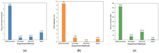 Comparison of the startup time and resource consumption of each simulation method. (a) Startup time of each simulation method; (b) CPU utilization of each simulation method; (c) Memory utilization of each simulation method.