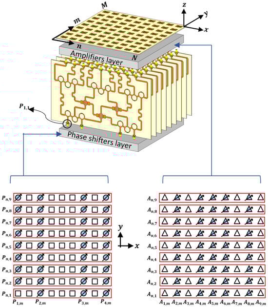 The number of elements is defined as N over the x axis and M over the y axis, the current excitation for each nm-th antenna element is set by Inm, and the phase excitation values are set by βx and βy at the values of (θ0, ϕ0) as the scanning angle.