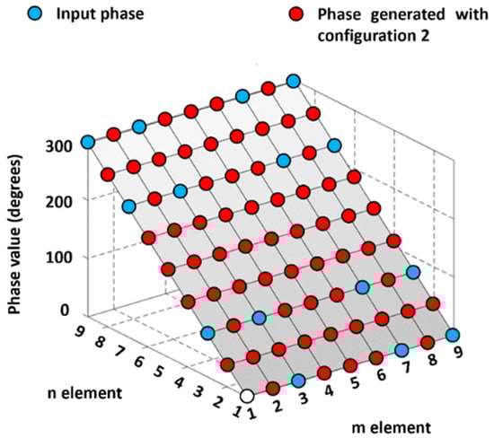 The design case 2 (illustrated in Figure 3) uses two stages of 4 × 9 CORPSs blocks (13 CORPSs blocks). The first stage utilizes four CORPSs blocks in order to generate 36 outputs to feed nine CORPSs blocks connected to the 81 antenna elements of the array system, i.e., 81 antenna elements are controlled by 15 phase shifters. The 2-D phased antenna system can achieve a reduction of 81% in the number of phase shifters used for a beam-scanning of ±30° in the azimuth and ±30° in the elevation plane. As with the previous configuration, the amplifiers layer is connected to the output of the feeding network. So, the amplitude control is operated in the same way. The phase shifters layer or phase control unit provides 15 phase values (blue color circles) to feed the first stage and to generate the rest of the output phases (red color circles) of the phase plane (81 phase values for the planar array) (see Figure 4) for beam-scanning. Please note that less control ports are required to feed the 81 antenna elements of the phased array system. As illustrated, the 2-D phased array system uses the 4 × 9 CORPSs blocks to generate the required phase plane for beam-scanning using less control ports or phase shifters.