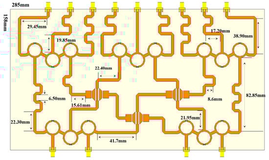 Figure 5 illustrates the novel feeding system based on four inputs and nine outputs using crossovers and 2 × 3 CORPSs networks [] by the ring power dividers/combiners. The dimension values of this feeding system are shown in Figure 5. This feeding system has been proposed to have a more stable transmission power, achieving better control of the output amplitude. This new 4 × 9 structure incorporates different division and recombination nodes (ring type), reducing by 50% the number of the resistors used in the feeding system with respect to previous works []. Furthermore, this new structure provides better phase control and has a number of recombination nodes lower than conventional feeding systems, and therefore, less losses by energy dissipation. The crossovers are used in the feeding system to avoid high values of phase difference at the input ports and to make more feasible the utilization of the raised cosine distribution.