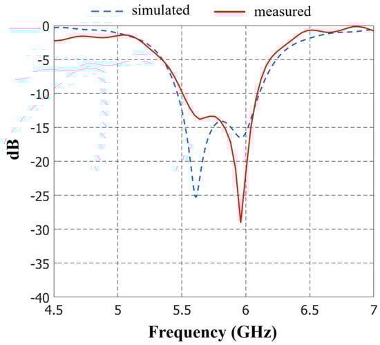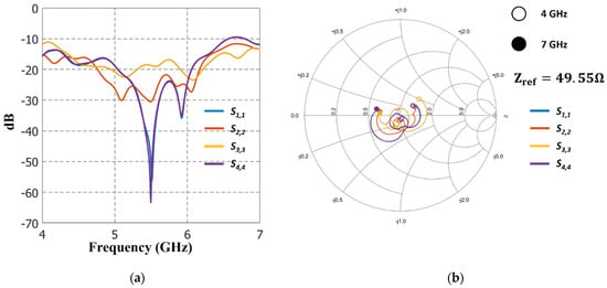 Figure 6 illustrates the behavior of the reflection coefficients (Figure 6a) and the behavior of the impedance of the feeding network system in the Smith chart format (Figure 6b). The reflection coefficients illustrate the good performance of the feeding system in a wide band with values of −15 dB in the operation range of 5.5–6.0 GHz. The behavior of the impedance of the feeding network illustrates adequate values to be matched in this operation frequency range.