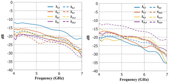 Figure 7 illustrates the behavior of the transmission coefficients of the novel 4 × 9 feeding network. The transmission characteristics obtained are adequate, considering the losses in each element of the network system and the SMA connectors. This new 4 × 9 CORPSs feeding network presents better features in terms of the reflection and transmission coefficients. This is because the crossovers of the new structure have a better performance with respect to the previous 4 × 9 feeding network.