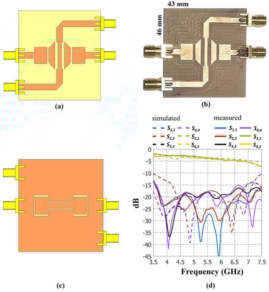 Crossover design of the novel 4 × 9 feeding system: (a) top view, (b) manufactured prototype, (c) rear view, and (d) reflection and transmission coefficients.