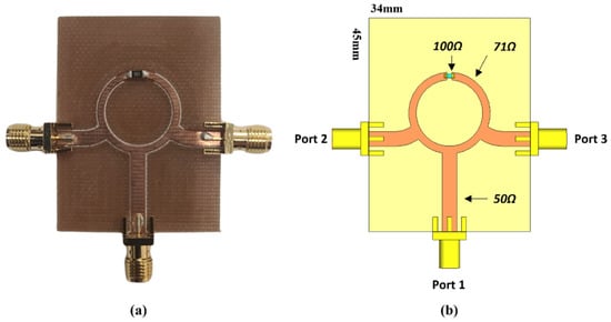 Figure 9 illustrates the ring type used as a divider or combiner in the new feeding network. This ring configuration offers a compact structure and better operation features with respect to a traditional power divider []. The dimensions set for our configuration are shown in Figure 9b. The operation features (in bandwidth) are interesting and very adequate for the 4 × 9 CORPSs feeding network and can be in observed in the behavior of the transmission and reflection coefficients shown in Figure 10.