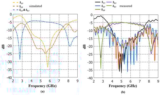 Behavior of the transmission and reflection coefficients for the ring-type node: (a) simulated and (b) measurements.
