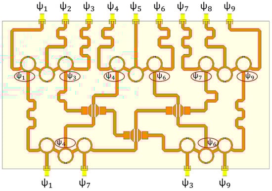 The behavior of the phase through the proposed 4 × 9 feeding network is as follows. The phase values required at the outputs of the feeding system can be determined by Equations (4) and (5) given previously. Then, each block of the 4 × 9 feeding system generates nine output phases (as shown in Figure 11) by using only four phase values given at the input ports. The knowledge of the phase values (ψ1, ψ3, ψ7, and ψ9) helps to build the other output phase states (ψ2, ψ4, ψ5, ψ6, and ψ8) required at the antenna system. The feeding network works as a phase interpolator. The nine output phases are generated by using and knowing the value of the two extreme phases and two center phases.