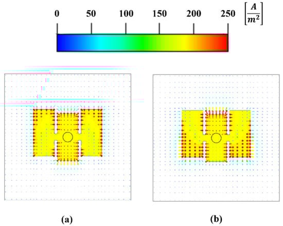 Current distribution of the chosen element for (a) 5.75 GHz and (b) 6.0 GHz.