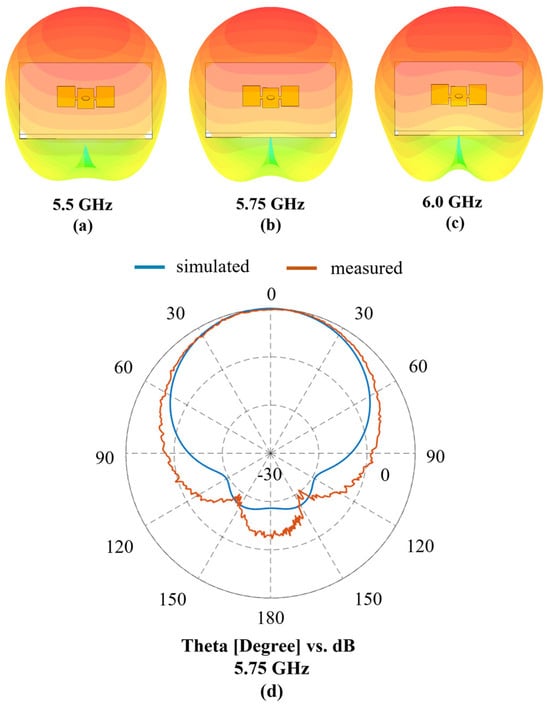Radiation pattern of the chosen element obtained by the simulation (blue color) in CST and experimental measurements (red color): (a) 5.5 GHz, (b) 5.75 GHz, (c) 6.0 GHz and (d) 5.75 GHz (cut at the azimuth plane).
