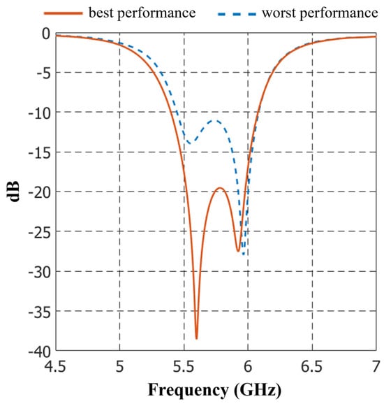 Each beam-scanning angle was assessed for the two proposed 2-D architectures. Each design case (for each scanning direction) showed good matching behavior and the value of the reflection coefficient was lower than −10 dB for the specified bandwidth. Figure 16 illustrates the behavior of the active reflection coefficient for the cases of the worst and best performance of the two proposed 2-D architectures. The configuration 1 presented the worst case for the farthest scanning angle.