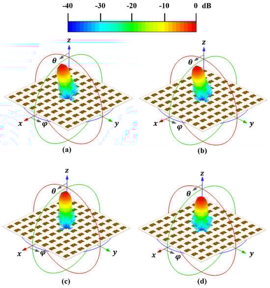 Figure 17 illustrates the 2-D phased array for the proposed antenna systems and the behavior of the 3D radiation generated using CST Microwave Studio. The cases shown in Figure 17 are as follows: (a) ϕ0 = 15° and θ0 = 18° for proposed case 2, (b) ϕ0 = 30° and θ0 = 10° for proposed case 2, (c) ϕ0 = 20° and θ0 = 10° for proposed case 1, and (d) ϕ0 = 40° and θ0 = 18° for proposed case 1. A good performance in the side lobe level was obtained for each beam-scanning angle analyzed for each proposed 2-D phased array. It reached a side lobe level performance of −19 dB.