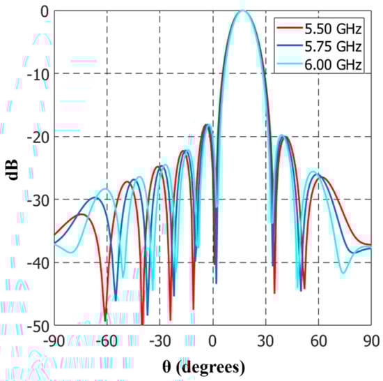 Furthermore, Figure 19 illustrates the behavior of the radiation pattern at 5.5 GHz, 5.75 GHz and 6.0 GHz for θ0 = 18° at the cut of ϕ = 0°. As observed in Figure 19, the behavior of the radiation pattern is retained if the value of frequency changes, i.e., there is no significant changes with those frequency changes.