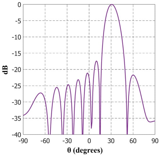 The feeding network design can operate at θ0 = 30° for ϕ0 = 0°, as shown in the radiation pattern of Figure 20. However, there is a trade-off between the scanning angle and the amplification value (gain value of the amplifiers). It is feasible to reach this scanning angle, but high values of amplification are required, as shown in Table 9 and Table 10. Furthermore, the side lobe level deteriorates to reach −17 dB.