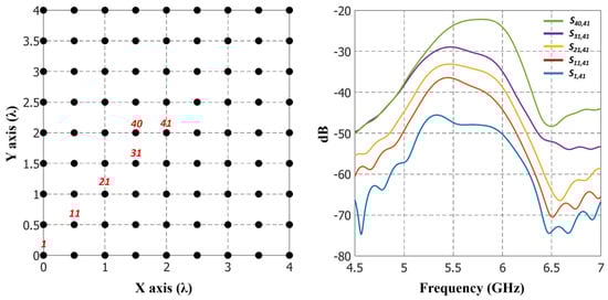 The interference among the antenna elements is defined by the mutual coupling between the elements. In this case, we determined the mutual coupling between different antenna elements that include different spacing between them. As you can see in Figure 21, the interference or mutual coupling between the antenna elements retained very low values. Figure 21 illustrates that the mutual coupling is higher when the distance is lower. The distance or uniform spacing (between elements) to be considered in the planar array is 0.5 λ. This spacing helps to maintain low values of mutual coupling.