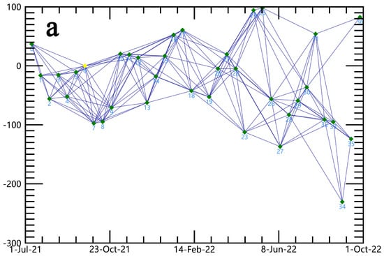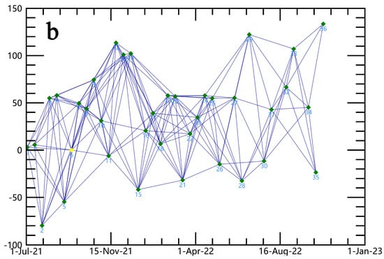 ENVI software (ENVI 5.6) was applied for data processing. The image from 19 September 2021 served as the reference (super-master) image for the ascending orbit data, whereas the imagery from 12 September 2021 was used as the reference (super-master) image for the descending orbit data. The remaining images were used as auxiliary images to align with the super-master image. The temporal baseline for the ascending and descending orbit data was limited to 80 days, with spatial baselines of approximately 155 m and 145 m, respectively. The independent use of ascending and descending track data resulted in 179 and 181 interferometric pairs generated, respectively. Figure 2 illustrates the temporal and spatial baseline connections for the ascending and descending orbit data. In Figure 2, the green points depict valid data pairs, while the yellow points signify the super-master images. The X-axis corresponds to the time dimension, and the Y-axis indicates the extent of the spatial baseline separating each image from the respective super-master image.