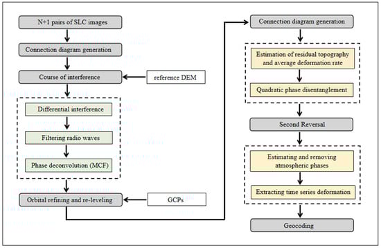 SBAS-InSAR is an innovative method of time-series analysis, introduced by Berardino et al. for the study of low-resolution and massive deformation []. The method utilizes short spatiotemporal baselines to generate time-series interferograms from multiple master images through flexible combinations. It employs singular value decomposition (SVD) for matrix inversion to derive the deformation sequences and average deformation rates of the study area over the observation period [,,]. Regarding SBAS-InSAR processing, SVD is used to decompose the design matrix into components, allowing for the identification of significant singular values that contribute to the stable solution, while discarding small singular values that correspond to noise or redundant information. This helps in regularizing the inversion process and ensures that the deformation signal is effectively extracted. The application of the SBAS-InSAR technique includes the following steps, as illustrated in Figure 3 [,,].
