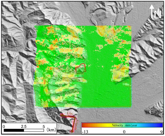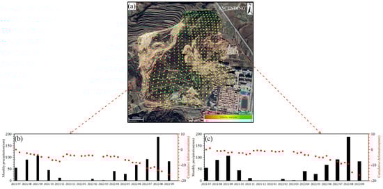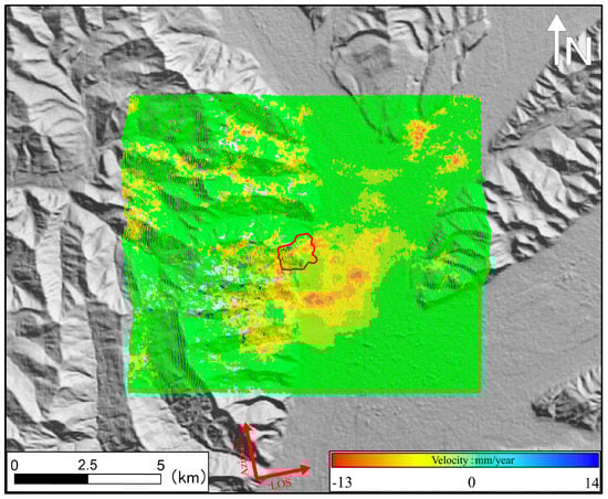 This study utilized the SBAS-InSAR technique to derive deformation results along the line-of-sight (LOS) direction. The analysis utilized ascending orbit data from July 2021 to September 2022 and descending orbit data from July 2021 to October 2022, obtained from the Sentinel-1 satellite, as illustrated in Figure 4 and Figure 5. The maximum deformation rate identified from both the ascending (Figure 4) and descending (Figure 5) orbits was -13 mm/year.
