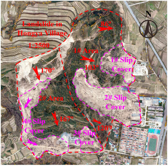 The Hongya Village landslide developed on the right coast of the Nanmenxia River (west bank) in the transition zone of low hills and valley plains northwest of Hongya Village. The landslide was a “traction–creep slip–push” composite landslide, and the plane morphology was “triangular”. The landslides on the northern and western sides were bounded by the back wall of the watershed and the steep and gentle junction, respectively, and the shear exit was the foot of the slope. The comprehensive analysis of the ground and borehole data demonstrated that the landslide was a “traction–creep slip–push” composite mega-landslide.