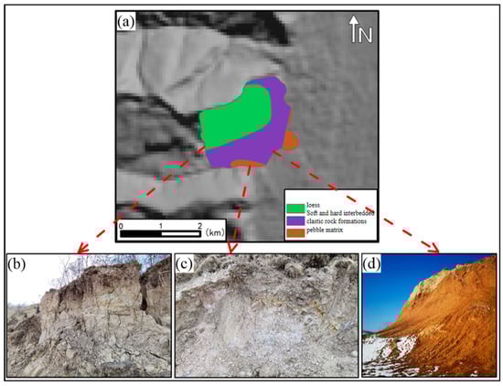 The landslide surface is dominated by Upper Pleistocene aeolian loess (Q3eol) (Figure 8a). The overall structure of loess is loose, with large porosity, low strength, vertical joints, and developed fissures. The shear and compressive strength are sensitive to water, and the strength when in contact with water decreases significantly. The loess is underlain by Neoproterozoic mudstone, which is poorly lithogenic and broken. These two sets of strata not only have low strength but also are extremely sensitive to changes in water content. They are highly susceptible to softening when they encounter water, which makes it easy to form a weak sliding surface and create a slippery layer. Concerning water from rainfall, landslides in such stratigraphic environments are susceptible to sliding due to the weak slippery layer []. Moreover, other studies have confirmed that the stratigraphic lithology can control and facilitate the progression of a landslide [,].