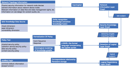 The flowchart of the method for constructing a knowledge graph of network security policies is shown in Figure 1. The knowledge graph proposed in this paper includes four layers, including the network information layer graph obtained by topology information; the security knowledge layer graph obtained by entity recognition, knowledge extraction, and knowledge fusion from security knowledge data sources; the detection logic layer graph obtained by transforming the policy text into a formal method related to ontology modeling; the logical dependency layer graph obtained by persistently storing default information and semantic parsing functions for policy text. In the four-layer graph, the detection logic layer graph is the core and contains the main content of the policy; the form of policy storage is event sequence and response. The network information layer graph is a collection of detection objects, including the detection targets of policies. The security knowledge layer graph is the basis for detection, and persistent and maintainable security domain knowledge provides the basis for detection. The logical dependency layer graph is an auxiliary tool for detection, mainly used to achieve automated and standardized consistency detection tasks.