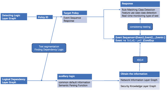 The flowchart of the method for policy consistency detection based on the knowledge graph is shown in Figure 2. Simply put, first, the event sequence and response of the target policy are obtained from the detection logic layer graph. Then, segment the policy text and query the default information and the semantic parsing functions related to it in the logical dependency layer graph. Subsequently, the semantic parsing function is introduced into the event sequence to retrieve unknown parameters from the security knowledge layer graph and network information layer graph, and the events in the event sequence are executed sequentially (written in a formal language similar to BMSL that combines Cypher syntax). Finally, consistency detection is achieved by comparing the execution results of the event sequence with the response corresponding to three different detection tasks.