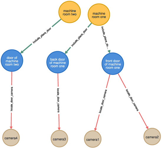 Let us first input some necessary information into the knowledge graph. For physical security policies, the network information layer graph focuses on the physical space of the policy and the information of network hardware in that physical space. So, we collected the actual situation and added nodes and relationships as shown in Figure 3 to the network information layer graph.