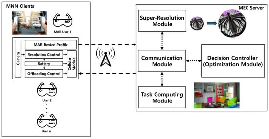 In this section, we outline the system architecture for a multi-user SR-supported MMN environment utilizing MEC, as illustrated in Figure 1. The system model consists of multiple MDs labeled as , along with a single MEC server linked to the core network with a network bandwidth of B and a computing capacity of . Each MAR client device is assigned a specific network bandwidth and possesses distinct computing resources . MAR tasks are represented as a vector comprising task workload density defined as CPU cycles per bit, offloading data size , and the resolution level of source data . Here, we assume that each MAR client executes only one MAR application per decision process, and this application may differ from those of other clients. Consequently, each MAR client has a unique MAR task workload and its data size. In this framework, MAR clients can offload their tasks to the MEC server to manage time-sensitive and computation-intensive MAR tasks given the MDs’ limited battery life and computing power. During the offloading process, the MD can transmit low-resolution source images to the MEC server, where the resolution is enhanced using SR to improve accuracy, thereby increasing MAR service satisfaction. Therefore, throughout the entire MAR process, including offloading and SR, MAR clients should optimize offloading and SR control for efficient MAR services.