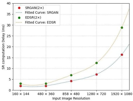 SR latency is significantly affected by the SR model used, the size of the input image (or its source resolution), and the available computing resources. Given that computing resources are limited and a more advanced SR model demands additional resources, the source resolution becomes the key parameter for influencing the SR latency. To optimize the SR computation latency, it is essential to understand how the resolution of the source image impacts this latency. Figure 3 illustrates the empirical results on how input image resolution influences SR computation latency. In this study, we employed two SR models: EDSR, based on the ResNet architecture, and SRGAN, based on the GAN framework. The dataset from [26] was used for experimentation. As shown in Figure 3, increasing the resolution of the source image leads to a higher SR computation latency, following a consistent pattern across both SR models for the same upscaling factor. This allows us to define the relationship between the input image resolution R, denoted as the number of pixels per height, and the SR computation latency (ms). Here, increases as a function of R because the computational workload grows with R. However, due to the complexity of analytically determining this relationship, a data-driven approach is more practical. This involves using offline training with empirical data to model the relationship. We employed regression-based modeling, a common technique seen in areas like mobile CPU property modeling, including CPU power and temperature variations [21]. Thus, we conclude that can be modeled as