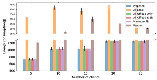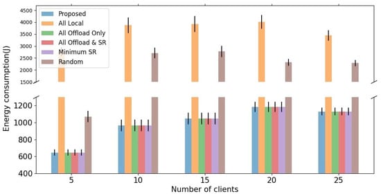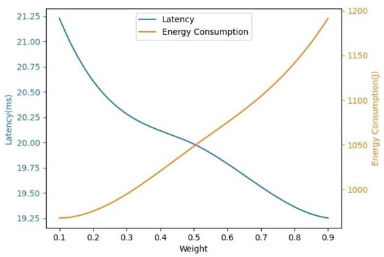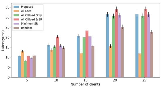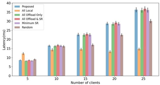To evaluate the impact of weight parameters for latency and energy consumption, we first evaluate the change of latency and energy consumption with different weight parameters and in fixed client number 15. We identify trends by measuring the latency and energy consumption with the proposed algorithm while changing only as the weight parameters and in the above experimental environment. As shown in Figure 5, the weight parameter for latency increases and the weight parameter for energy consumption decreases, and the computation latency decreases and the energy consumption of MAR clients increases. On the contrary, as increases and decreases, the energy consumption of MAR clients increases, and the computation latency decreases. This means that latency and energy consumption are in a trade-off relationship regarding weight parameters and . Since this paper aims to balance the latency, energy consumption of MAR clients, and service satisfaction, we choose weight parameters and for performance evaluation.