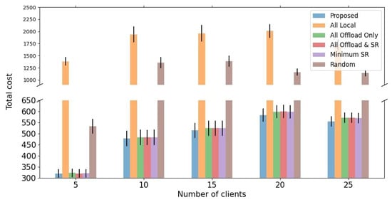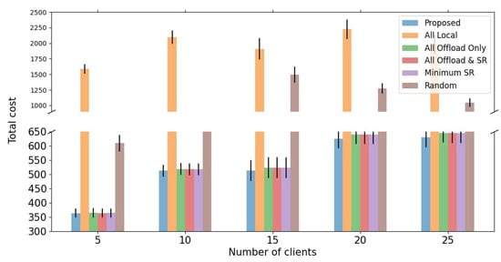 Next, we evaluate the performance of the proposed algorithm and benchmarks in terms of latency, energy consumption, and total cost that we defined with two different SR methods, EDSR and SRGAN. First of all, Figure 6 shows the result of the proposed total cost model from the proposed algorithm and benchmarks with the EDSR SR model. The proposed algorithm achieves the minimum values at the cost function compared to benchmarks. This is because the proposed cost model considered not only latency and energy consumption but also the satisfaction of service quality obtained from video resolution by balancing all those factors. This is why the proposed algorithm achieves the minimum cost despite the proposed algorithm not gaining the definite minimum value in latency and energy consumption. Finally, the reason why benchmark 4 achieved a higher total cost than our proposed algorithm is that it is difficult to accurately adapt the satisfaction caused by SR process with a rule-based algorithm. Therefore, we can conclude that optimizing the offloading and SR decision leads to the balance of the computation latency, energy consumption, and service quality.