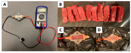 Following methods described by S. Wang et al. [], 3 mm Layfomm40 slices were FDM 3D printed and painted. Slices were then soaked for 24 h in saline at different concentrations. Five slices were packed in a volume-constrained resin box (45 × 15 × 15 mm) hosting 0.5 × 15 mm square copper electrodes on either side (Figure 3A). The electrodes were connected to a multimeter to measure electrical resistance. Five samples were recorded for each of the following saline concentrations: 0.45%, 0.9%, 1.35%, 1.8%, 2.5%, and 4%. As a control, the experiment was repeated for 10 samples of porcine myocardium (Figure 3B–D), acquired from the heart ventricles of pigs slaughtered 3 days prior and stored at 4 °C. Two outliers were identified among the samples of porcine myocardium using the quartile method on MATLAB with the inbuilt function “isoutlier”. These two outliers were removed from further calculations.