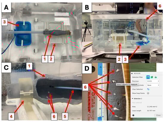 (A,B) The test phantom (1) was clamped in place on the base (2) to record impedance and perform ablation lesions (6). The tank was filled with saline; its temperature was maintained at 37 °C using a thermostat. The blue grounding patch (3) was placed inside the saline, ensuring a secure electrical connection to the radiofrequency generator throughout the simulations. (C) The open test phantom (1) is held by the clamps (4). The Thermocool SmartTouch SF catheter (5) was used to probe system impedance and perform ablation lesions (6). (D) Fusion 360 was used to digitally measure the surface area of each ablation lesion (6).