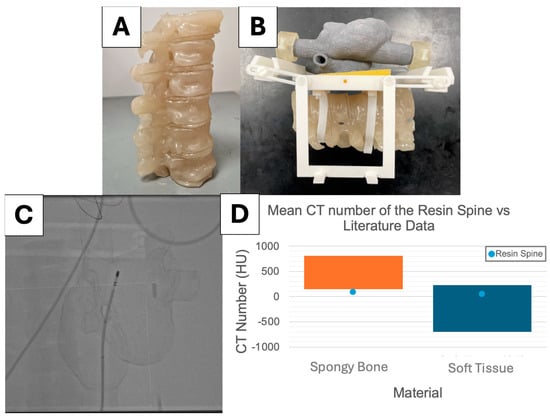 (A) The final, fully assembled spine. (B) The fully assembled base with the X-ray spine phantom. (C) High-dose fluoroscopy image of the fully assembled simulator, including the spine. (D) The mean CT number acquired from the vertebrae (92.8 ± 10.5 HU) compared to spongy bone (148 to 661 HU) and the intervertebral disks (47.6 ± 9.4 HU) compared to soft tissue (−700 to 225 HU) [].