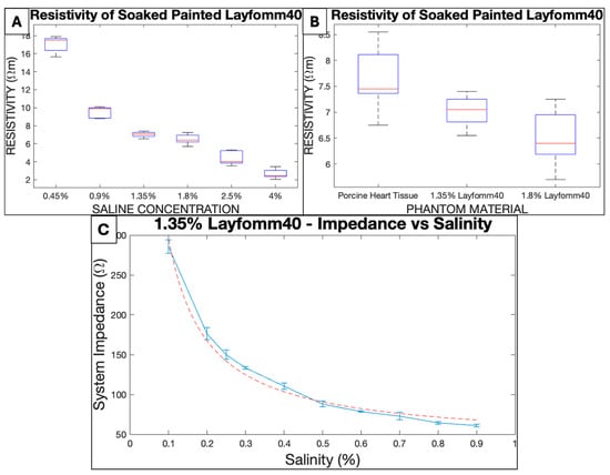 (A) Resistivity of stacked painted Layfomm40 slices (3 mm). (B) Resistivity of stacked painted Layfomm40 slices (3 mm) in comparison to fresh porcine myocardium. (C) The inverse relationship between system impedance and tank salinity using a painted Layfomm40 phantom (3 mm walls soaked in 1.35% concentration saline for 24 h).