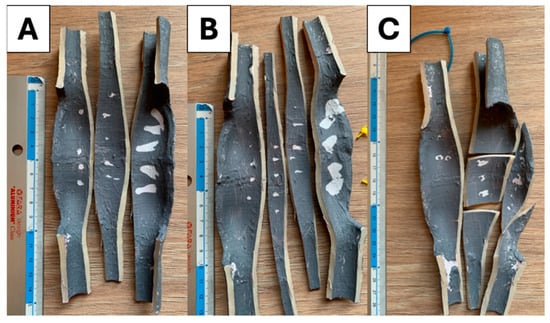 Ablation lesions from posterior to anterior (left to right). (A) Ablation lesions performed at 75 W Higher Power Irrigated settings. (B) Ablation lesions performed at 45 W Lower Power Non-Irrigated settings. (C) Ablation lesions performed at 45 W Lower Power Irrigated settings.