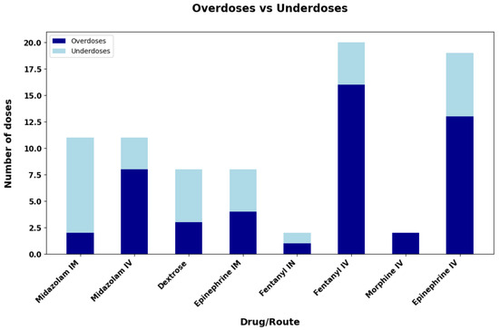 Distribution and categorization of overdoses vs. underdoses for all drugs out of 288 total doses.