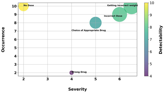 FMEA is used to proactively identify potential failures in various components and processes within the healthcare system. This entails systematically evaluating each failure mode by assigning scores on a scale from 1 to 10 for potential severity (S), likelihood of occurrence (O), and likelihood of detection (D). Subsequently, Risk Priority Numbers (RPNs) are computed (), allowing for the prioritization of the identified failure modes. Figure 2 presents an RPN scatter plot that illustrates the priority failure modes along with their corresponding S, O, and D values.