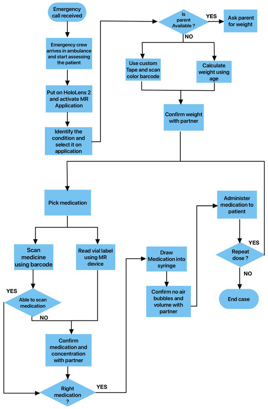 We aim to design and develop a prototype of a head-mounted MR application using Microsoft HoloLens 2 headsets and its unique ability to seamlessly blend virtual overlays with real-world elements. Our solution revolves around the integration of augmented intelligence to guide paramedics through the complex process of pediatric medication administration. This technology automates the medication verification process and provides virtual assistance to paramedics, aiming to improve the accuracy and safety of PMA medication in EMS. Paramedics can interact with the MR application to select the specific patient condition, access weight-based dosage instructions, and receive step-by-step guidance for medication dilution, alongside checklists at each critical step, prompting confirmation before proceeding. A detailed flow diagram outlining the proposed solution, encompassing both the application-as-a-guide and MR device approaches, is presented in Figure 3. Upon receiving an emergency call, the application guides the paramedic through a visual overview to select the patient’s condition, followed by requesting weight information. The paramedic can launch the application from the app menu on a HoloLens 2 device using hand gestures.