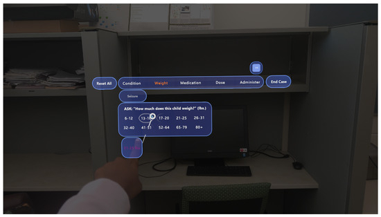 The development environment for this approach primarily uses Unity as the editor, facilitating the implementation of interactive features. In addition, the scanner is connected to the MR device via Bluetooth. To ensure compatibility, incorporating modules such as Windows Build Support (IL2CPP) and Universal Windows Platform Build Support within the Unity Hub environment makes the app compatible with various platforms, allowing it to run on all Windows devices. To enhance the mixed-reality experience, we use the Mixed-Reality Feature Tool alongside Microsoft Visual Studio Community 2022 for deployment on MR devices. We envision our approach as a comprehensive tool for emergency medical teams to streamline the process of diagnosing patients and selecting the appropriate medications. Figure 4 shows a screenshot of the mixed-reality application on a HoloLens 2 device. In instances where a parent or legal guardian is not available to inform the patient’s weight, the application offers two alternative methods. The first method utilizes a customized tape for length/height measurement and identifying the color group.