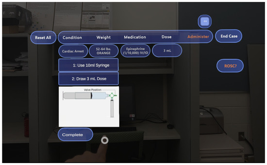 In this approach, we use a custom-designed tape embedded with unique barcodes and colors assigned to various weight categories. The MR device is integrated with the barcode tape, which corresponds to distinct weight groups. By scanning these barcodes, pediatricians can quickly and accurately determine the patient’s weight, facilitating precise medication dosing. Upon identifying the color of the tape, the user scans the corresponding barcode, which displays a weight range on a visual screen for confirmation. Once the weight is obtained, the application prompts the user to scan the barcode of the medication to verify the correct identification and concentration. Alternatively, the application can enlarge the vial labels for easy reading by incorporating DCNN and OCR techniques. If scanning is not feasible, medical personnel should consult with a partner before proceeding to draw the medication into the syringe. The application provides visual guidance for drawing the medication into the syringe using a stopcock (Figure 5). An essential safety measure includes inspecting the syringes for air bubbles, with prompts for correction if necessary. Once the medication is administered, the application prompts the user to check blood pressure, followed by a repeat selection of the dosage protocol if needed, ensuring detailed drug administration protocols. Importantly, the application records the time during dose selection for accurate documentation. In this way, the application not only improves the accuracy of medication dosing by providing tailored information based on real-time data but also streamlines the workflow for healthcare providers, making it an invaluable tool in pediatric care.