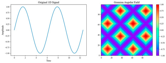 The GAF is a method used to encode time series data as images, which can then be processed by image-based deep learning algorithms. The GAF transforms a one-dimensional time series into a two-dimensional image by representing the angular relationship between each pair of time points. The GASF is one of the two types of GAF. It captures the angular relationships by computing the summation of cosine values between time points. The calculation process is shown in Figure 2. The formula for GASF is as follows: