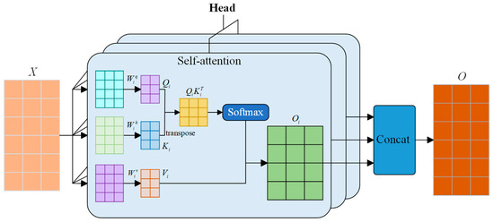 where Q, K, and V in the formula represent matrix Query, Key, and Value, respectively; headh represents the number of heads; and represents a linear transformation matrix. Each head is computed as