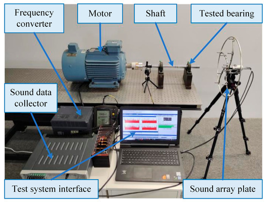 In this study, the experimental data are collected from a self-built test rig. Figure 5 shows the configuration of the experimental test system, which is used to verify the feasibility of the proposed method. The entire system consists of a frequency converter, motor, shaft, test bearing, data acquisition device (model: PAK MKII SC42, B&K, Copenhagen, Denmark), array microphone circular board, and array microphone sensors (model: BSWA MPA436, sensitivity: 15.5 mV/Pa, sampling frequency: 16,384 Hz). During the experiment, the motor drives the rotating shaft and the test bearing to rotate, and the array microphones collect the acoustic signals generated during the operation of the bearing in real-time. These signals are transmitted to the data acquisition device and then to the computer for analysis. The array microphones, which consist of multiple sensors, accurately locate the sound source and have high resolution and sensitivity, capable of capturing weak acoustic signals. This is extremely important for detecting early faults and subtle anomalies in bearings.