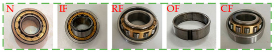 In the experiment, five different types of bearing faults were created, including normal state (N), inner race fault (IF), rolling element fault (RF), outer ring fault (OF), and cage fault (CF), as shown in Figure 6. Each fault was introduced through precise mechanical damage in a laboratory environment. The authenticity of each fault type was further validated through vibration signal analysis in both the frequency domain and time-domain feature extraction techniques. This ensured the effectiveness of the dataset for fault diagnosis tasks.