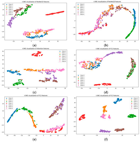 Figure 8 shows the t-SNE dimensionality reduction results of features extracted by different modules. Each point represents a sample, with different colors indicating different classes. In Figure 8a,b, the ResNet1D module demonstrates a certain level of discriminative ability in feature extraction, while the ResNet2D module exhibits a higher capacity in capturing spatial features. The distribution of features extracted by the multi-head attention mechanism after t-SNE dimensionality reduction is shown in Figure 8c, indicating that the attention mechanism performs excellently in feature extraction and classification, effectively capturing the relevant information in the data. From Figure 8d–f, although there is some discrimination of different classes in the two-dimensional space, there is still some overlap. This suggests that the features extracted by the FC1 layer have relatively weak discriminative power, requiring further feature extraction and processing. Compared to the FC1 layer, the FC2 layer shows improved clustering effects in the two-dimensional space, with more dispersed distribution and less overlap of different classes, indicating that the FC2 layer performs better in feature extraction and discrimination. The features of the FC3 layer exhibit more distinct clustering effects in the two-dimensional space, with clearer distribution of different classes. This suggests that as the network depth increases, the model’s feature extraction ability gradually enhances, allowing for better differentiation of different classes.
