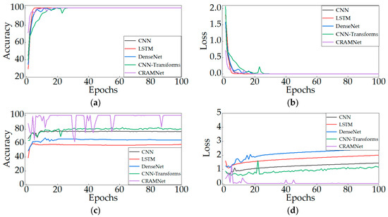 From Figure 9a,b of the training stage, it can be seen that the CNN and LSTM training accuracy rapidly rises and stabilizes, ultimately stabilizing at a higher level. The training accuracy and training loss of the DenseNet method change trends are similar to those of CNN, but the starting point is lower. The training accuracy and training loss of the CNN-Transformer method change fluctuates greatly, which may be caused by the instability of training due to data augmentation. The training accuracy of CRAMNet rapidly rises in the early stage and ultimately reaches an accuracy of nearly 100%, and the training loss also significantly decreases, showing good training effects. From Figure 10c,d of the testing stage, it can be seen that the testing accuracy and testing loss of CNN, LSTM, and DenseNet methods are generally poor, and the testing loss decreases slowly. The testing accuracy and testing loss of the CNN-Transformer method fluctuate greatly, showing a certain instability. The testing accuracy of CRAMNet remains at a high level throughout the training process and gradually increases. The testing loss rapidly decreases and remains at a lower level, showing good generalization ability. In summary, CRAMNet performs well in both training and testing stages, with the advantages of fast convergence, high accuracy, and low loss. Compared with other methods, CRAMNet demonstrates better performance and robustness, proving its superiority.