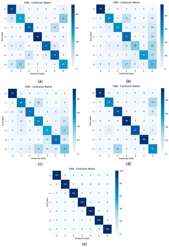 Confusion matrix results for different models: (a) CNN; (b) LSTM; (c) DenseNet; (d) CNN-Transformers; and (e) CRAMNet.